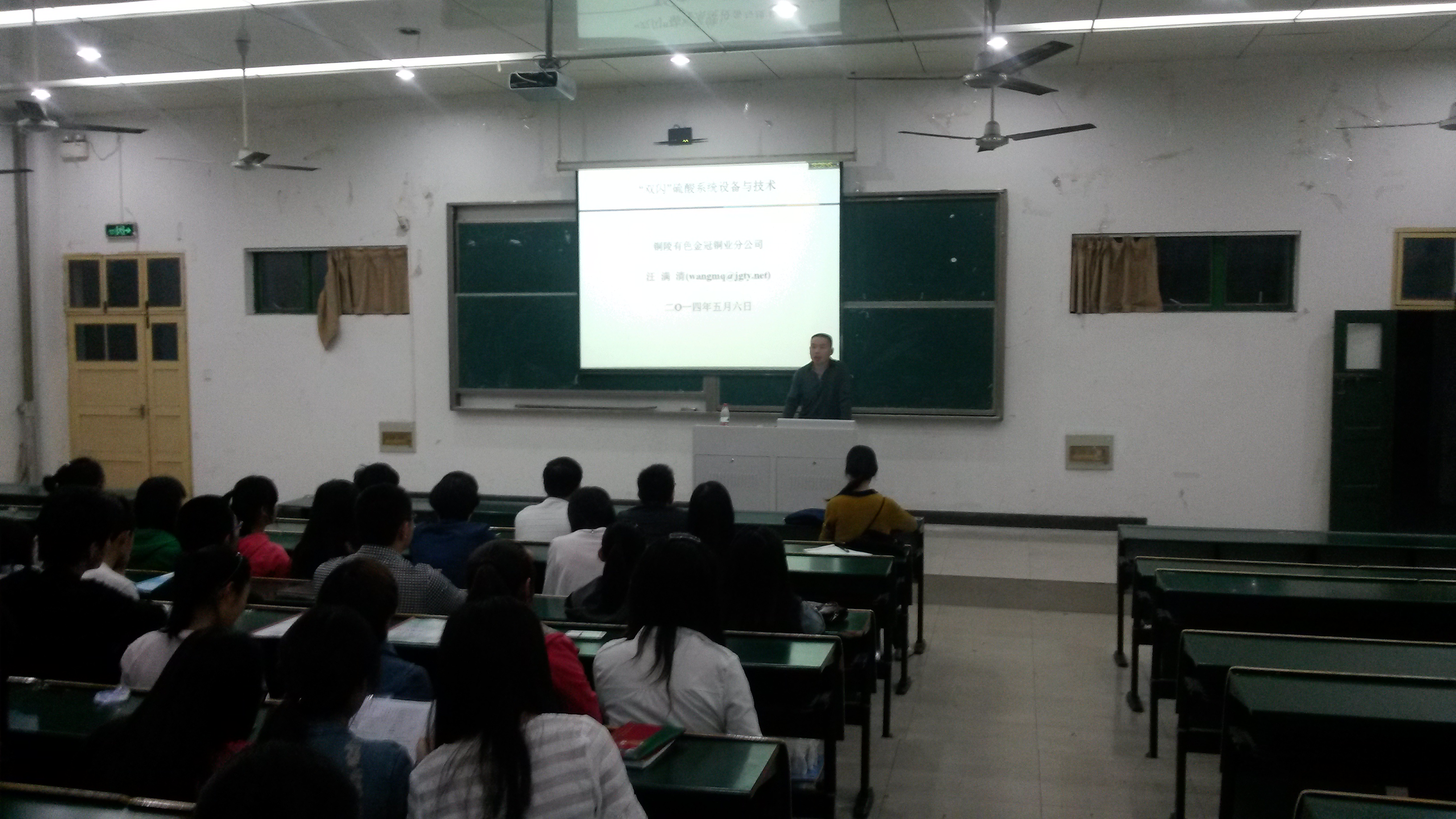 2014年5月6日19时在学院阶102教室,铜陵有色金冠铜业分公司(习惯称之“双闪”)硫酸车间主任高级工程师汪满清给同学们带来了一次精彩的讲座。该讲座原定于2014年5月16日,因双闪即将进行全面停车大修故提前。讲座的内容主要有:“双闪”概况、硫酸生产过程新技术、DCS自动化控制、安全环保、企业管理以及企业对高技能人才要求等。介绍中,同学们知道了双闪拥有:世界上单套铜生产能力最大装置,自主开发了高浓度二氧化硫转化技术(该技术正在申报国家专利),更为先进的自动化联锁控制,5S管理清洁生产,PDCA质量管理等,最后,汪主任以青蛙登塔故事给大家以生活启迪,鼓励大家要以积极、乐观和投入的态度去对待学习和今后的工作,讲座赢得一次又一次热烈的掌声。听取讲座的人员有部分专业老师和12、13级化工、冶金专业学生。
