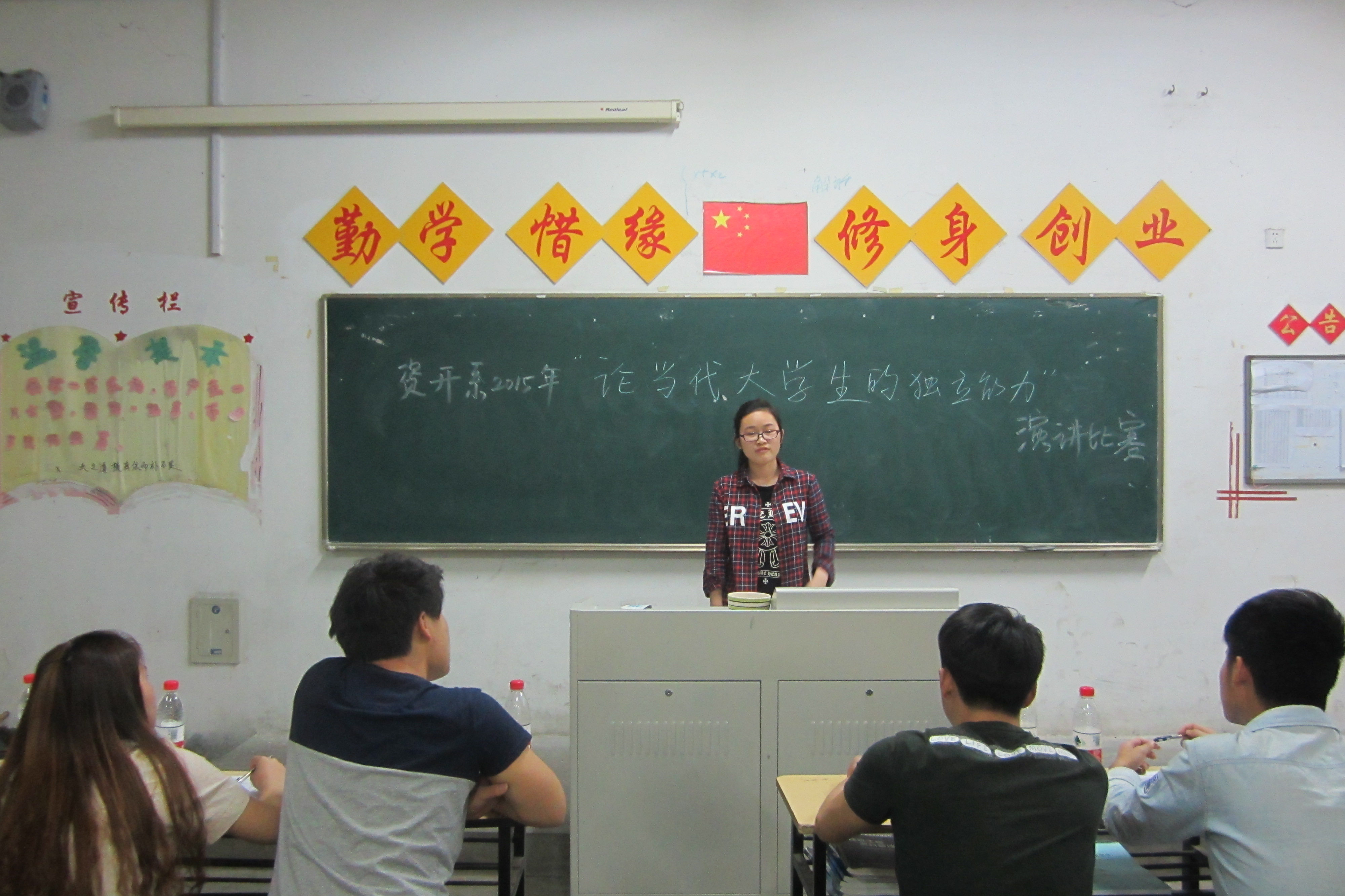 2015年4月27日下午,由我校资源开发系宣传部主办的“论大学生的独立能力”主题演讲比赛在教学楼教室101展开帷幕。此次活动的目的是为进一步提升我系学生对于当代大学生的各方面独立能力的一种思考,促进学生精神文明建设,展现当代大学生特有的风采,并由系学生会的各个部长担任评委。
