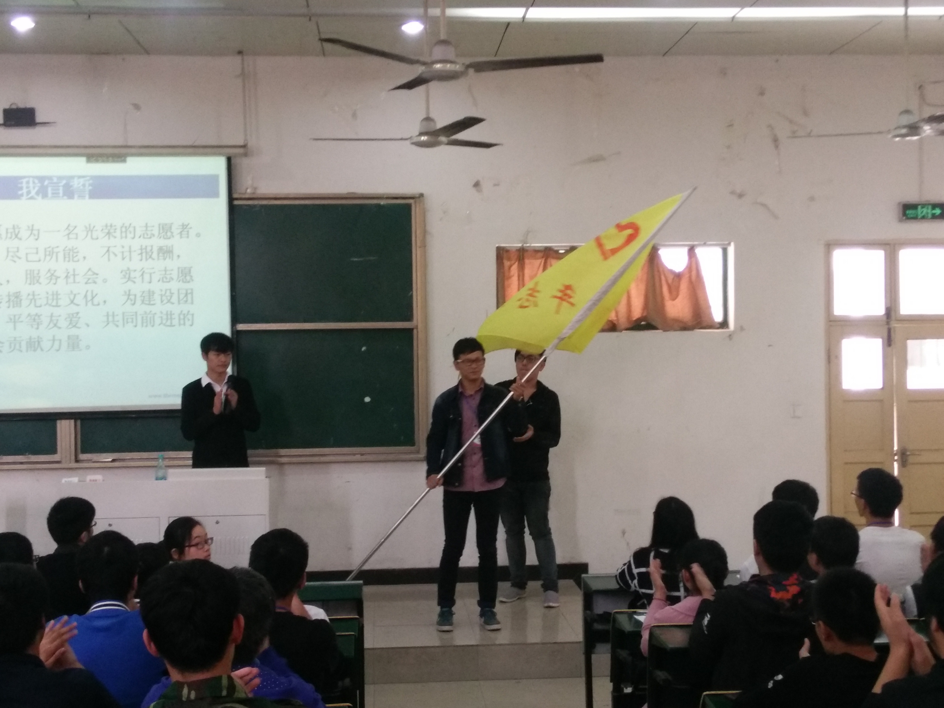 大会第二部分:由15造价2班的吴琼宣读了我系志愿者工作的精神与核心;学生代表罗璇、张艳上台发言并阐述了自已对志愿者的看法和心愿。此次大会以15建筑2班团支书张驰作为青年志愿者代表从实践部部长辛家根手中接下志愿者的旗帜作为本届青年志愿者的活动正式拉开帷幕的一个标志。