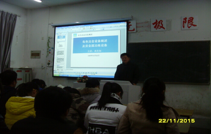 2015年12月22日晚,资源开发系14、15级冶金专业学生齐聚教学楼111教室,聚精会神地听着铜陵有色稀贵金属公司技术高管、教授级高工孙先如关于有色冶炼设备的知识讲座。