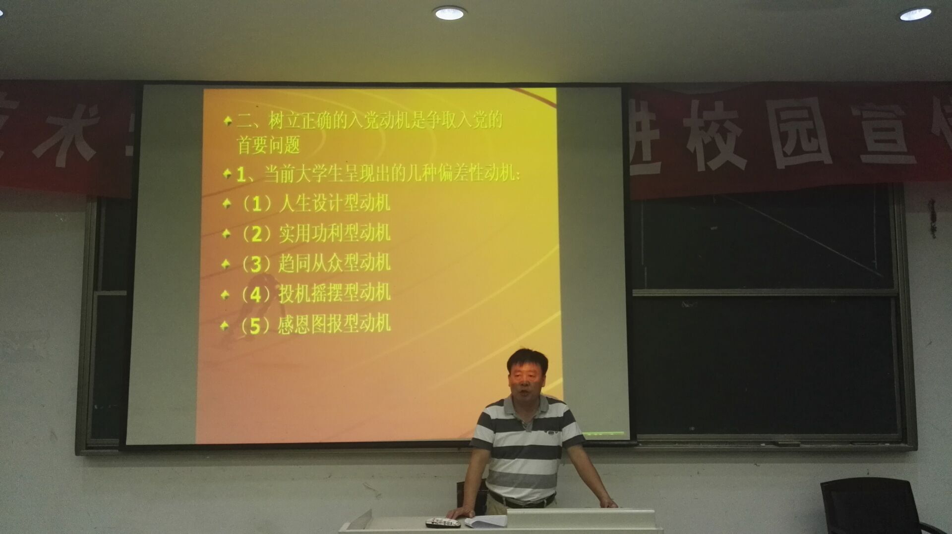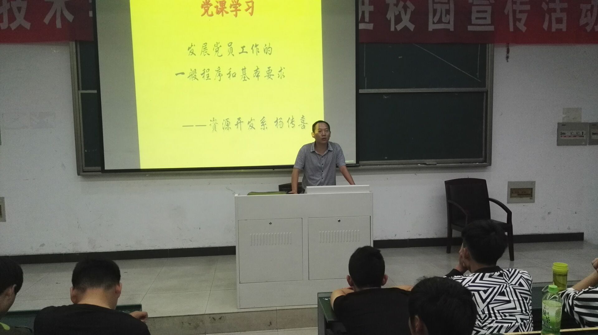 阶梯教室面向全体新生开展一次党课知识讲座。杨传喜和江双全两位老师分别作题为《发展党员基本程序和基本要求》和《树立正确入党动机,争取早日加入党组织》两场讲座。