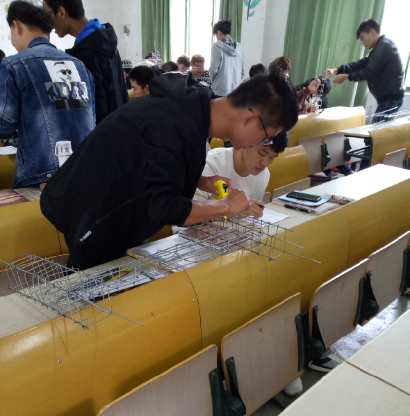 竞赛在指导老师的组织下,经过前期的小组报名、钢筋下料计算汇总、加工工具发放,到学生在教室现场绑扎制作、各小组相互进行钢筋安装检验批的检查与验收,各工序井井有条,全体建筑专业学生积极参与,虽然钢筋弯曲和钢筋绑扎工作既辛苦又危险,但是还是认真对待,克服各种困难,完成梁、柱钢筋骨架内所有纵筋、箍筋、腰筋、拉结筋的组装。经过此次钢筋模型制作竞赛,加深了全体建筑专业学生对16G101系列图集的理解,提高了学生的对混凝土结构钢筋工程的制作规范的掌握,将做与学融合一体,深受学生的支持和欢迎。