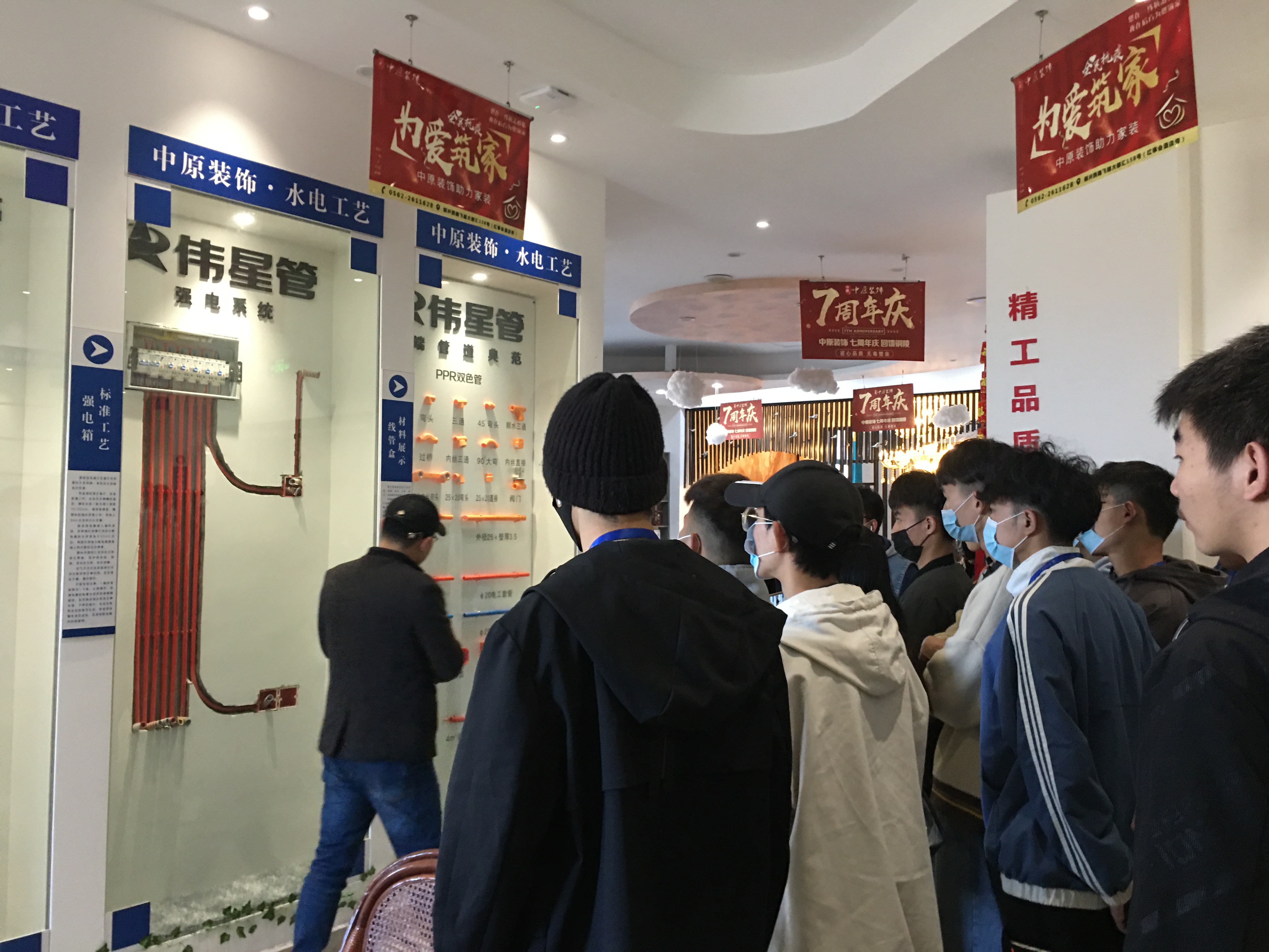 首先来到中原装饰公司工艺展厅参观学习,在公司设计总监的专业、详细的介绍下,学生对本专业第一线的工作内容有了更具体认知,从而了解建筑装饰企业组成、性质等各方面内容;带领学生学习了建筑装饰隐蔽工程、墙面、顶面、地面等工程的施工工艺,并且参观了公司的装修样板间,领略了当下流行的设计风格和装饰效果,学生认真记录笔记并和设计总监进行了现场互动沟通。