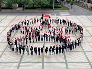 人形团徽,致敬百年。在合唱的尾声,同学们手拉手逐渐形成团徽的图案。生动展示了学生们愿听从党的号召,积极投身报效祖国的青春风采。