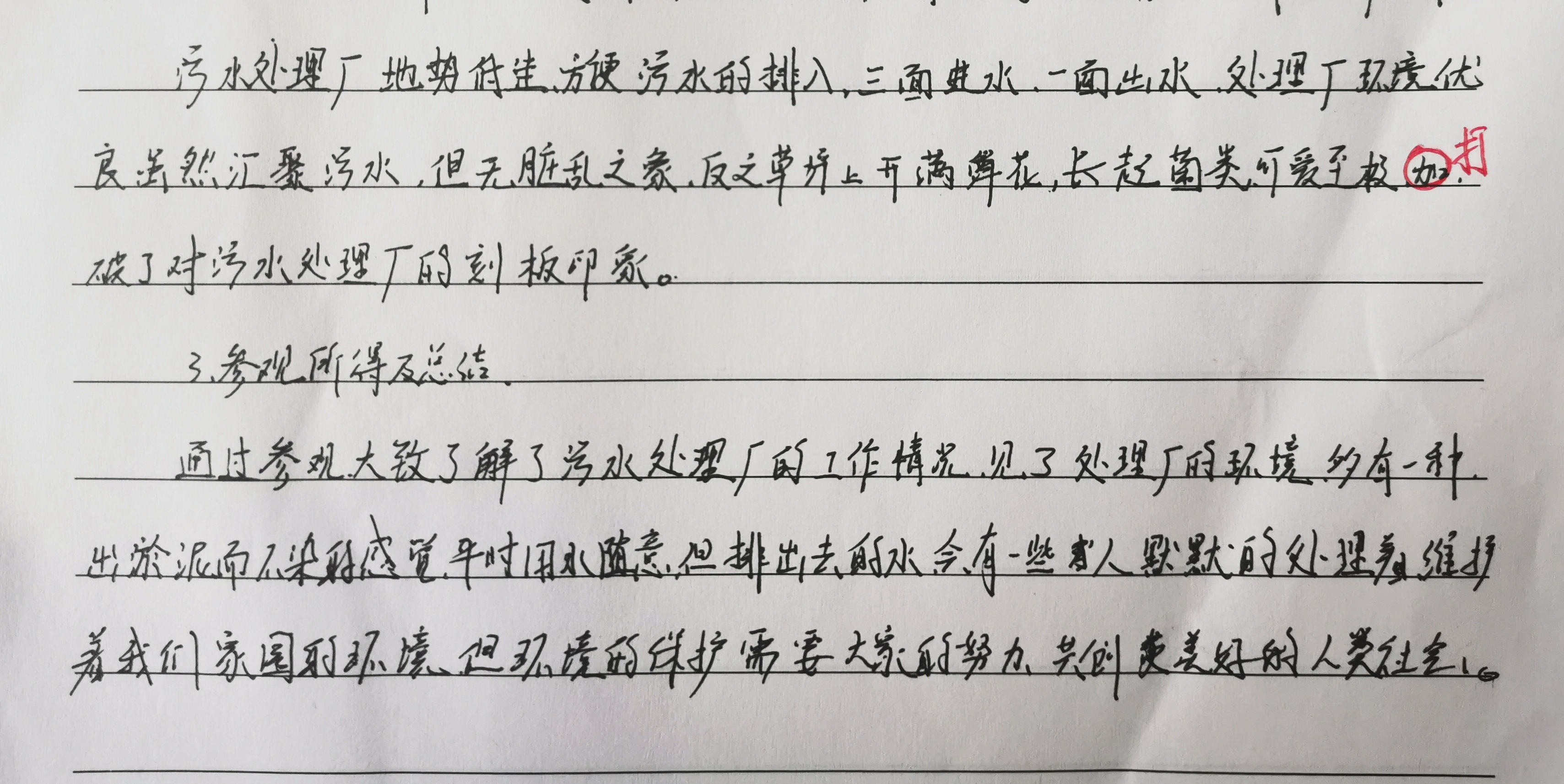 参观结束后,同学们撰写了实习报告,在心得感受方面,同学们纷纷表示受益匪浅,不仅了解了污水从浊到清的整个过程,更看到了污水处理人的专业、敬业与付出,同时也激发了同学们努力学习新知识、新技术的热情和积极投身环保事业决心。