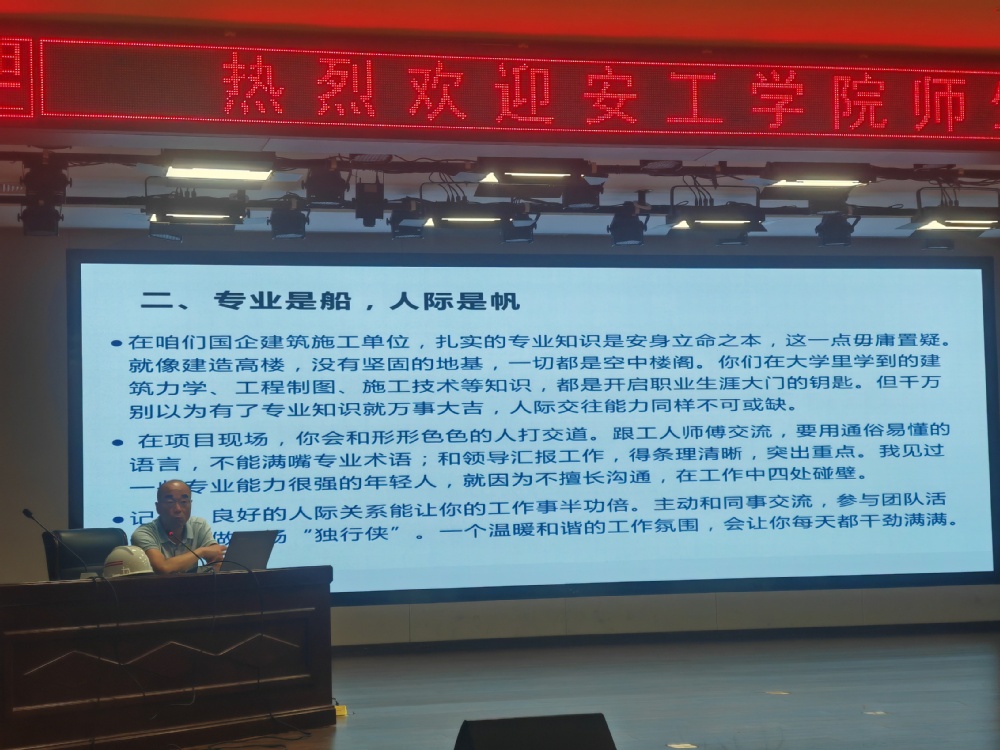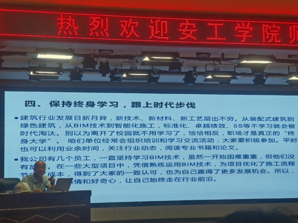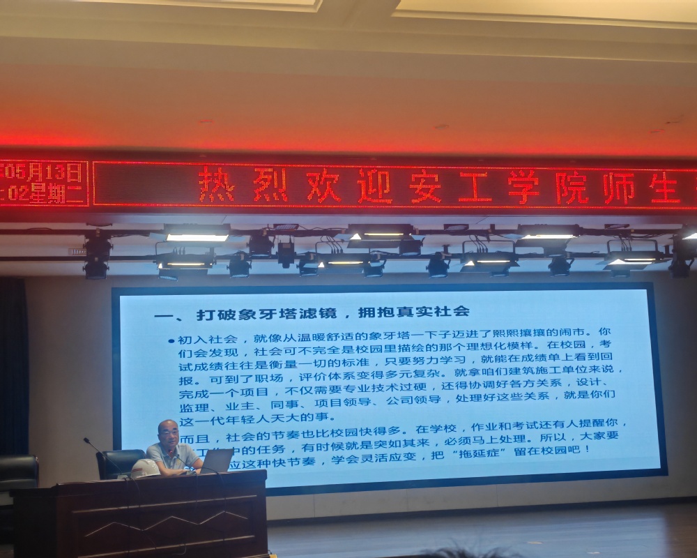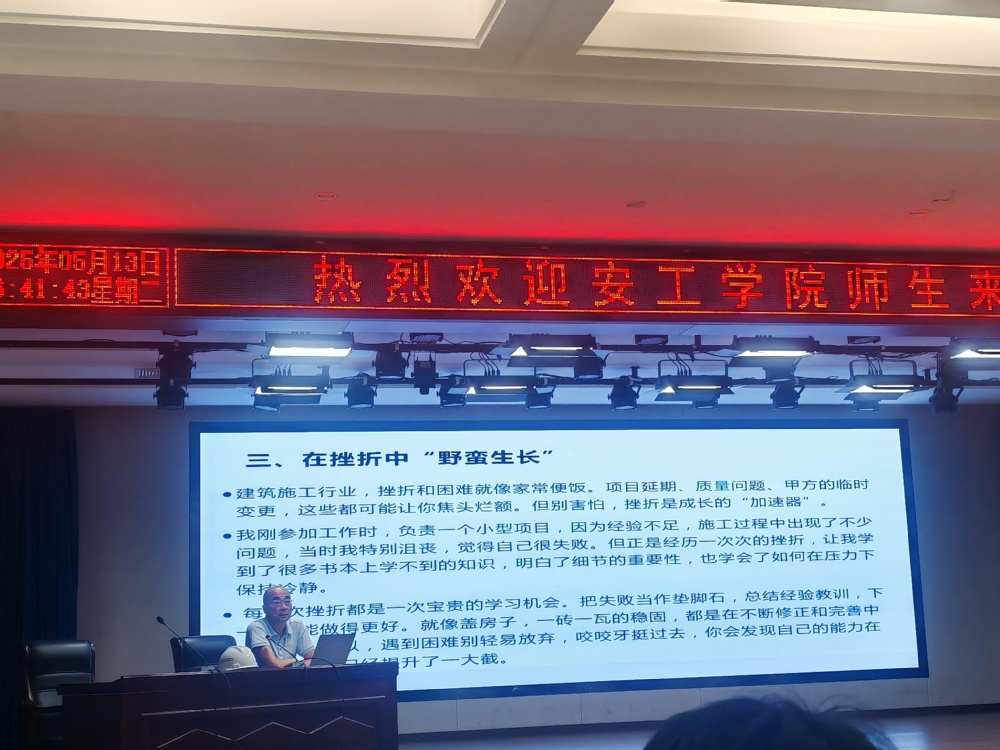 2025年5月13日下午beat365建筑工程技术产业教授有色建安公司高级技术主管彭建给建筑专业学生带来一场别开生面的讲座,资源开发系建工教研室师生参与。