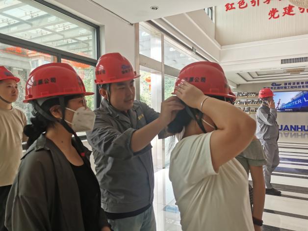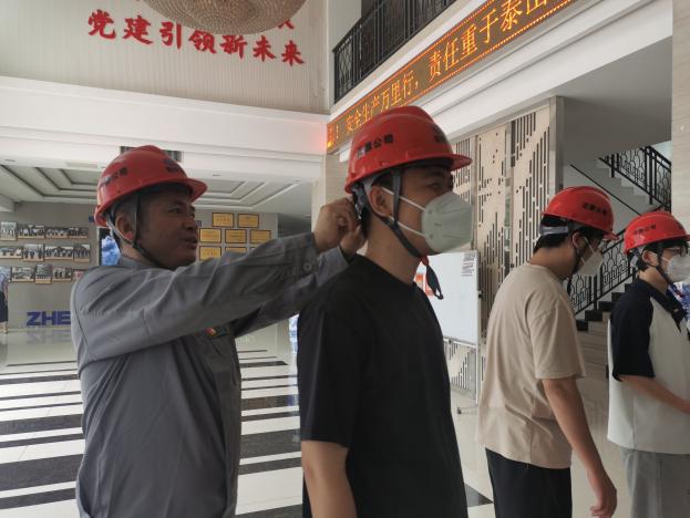 活动伊始,公司安环部章部长向同学们强调了安全生产的重要性,并现场演示了安全帽的正确佩戴方法。在章部长的指导下,同学们相互练习,掌握了个人防护装备的使用规范。"安全是环保工作的第一道防线,只有做好自身防护,才能更好地保护环境。"章部长表示。随后,公司汪总向同学们详细介绍了当天的参观流程,让大家对危废处理的全产业链有了初步认识。